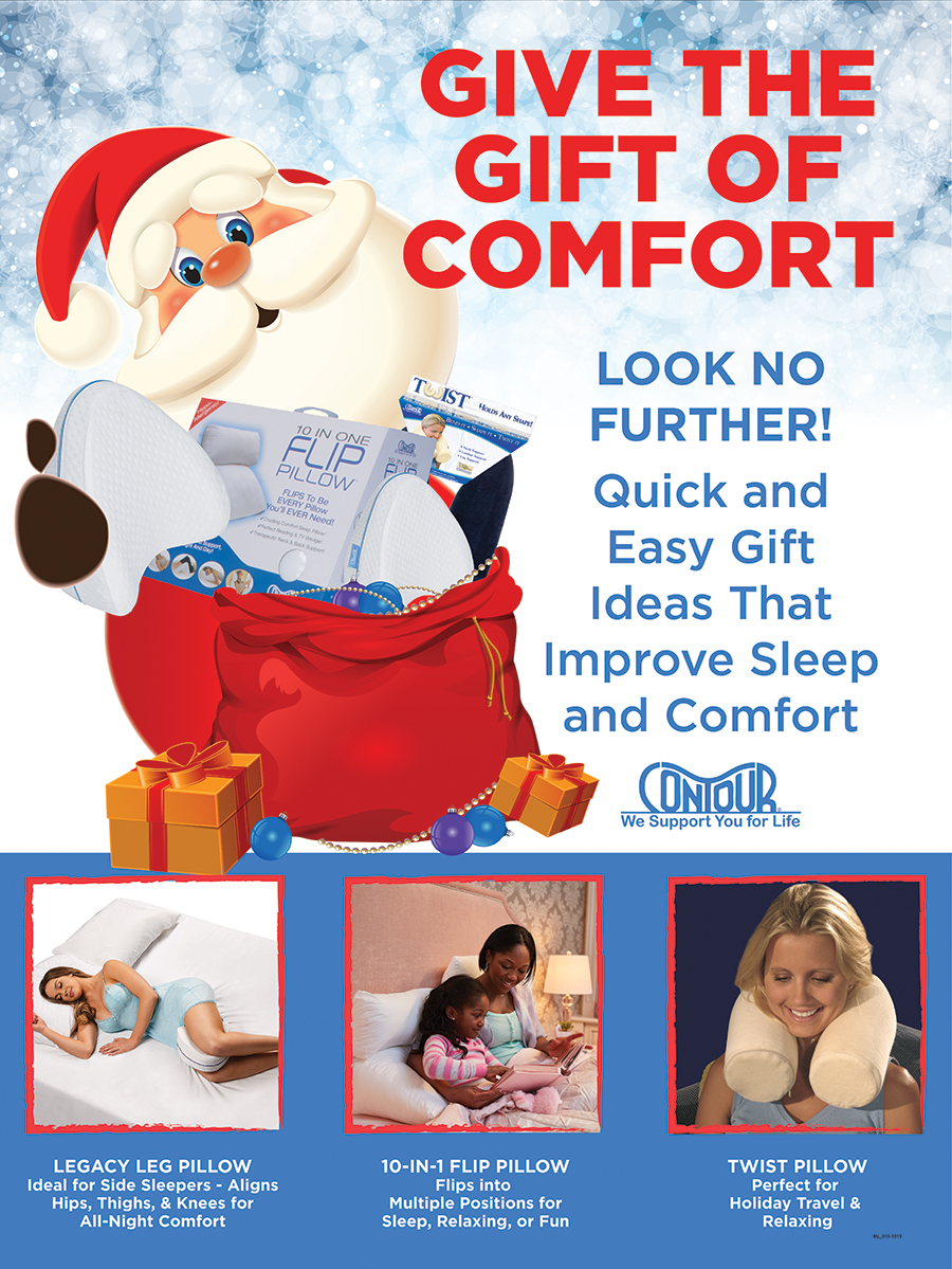 Holidays are frantic and shopping can be stressful. Make it easy to find the perfect gift by displaying great grab-n-go gifts such as Contour’s Twist Pillow, Flip Pillow and Legacy Leg Pillow. Be sure to remind your customer to get one for themselves too – so they can relax this season and all year long.